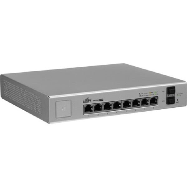Ubiquiti Networks US-8-150W UniFi Switch is a fully managed 8-port PoE+ Gigabit switch designed for scalable enterprise networks. With (8) Gigabit RJ45 ports, flexible IEEE 802.3af/at PoE+ and 24V passive PoE support, and (2) Gigabit SFP ports for fiber uplinks, this switch delivers exceptional performance, intelligent switching, and a total PoE budget of 150W—making it ideal for powering UniFi access points, IP cameras, and VoIP phones.